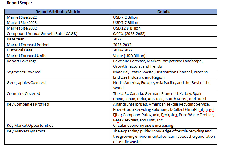 Textile Recycling Market Size was valued at USD 7.2 Billion in 2022. The Textile Recycling industry is projected to grow from USD 7.7 Billion in 2023 to USD 12.8 Billion by 2032, exhibiting a compound annual growth rate (CAGR) of 6.60% during the forecast period (2023 - 2032). The expanding public knowledge of textile recycling and the growing environmental concern about the generation of textile waste, are the key market drivers enhancing the market growth.